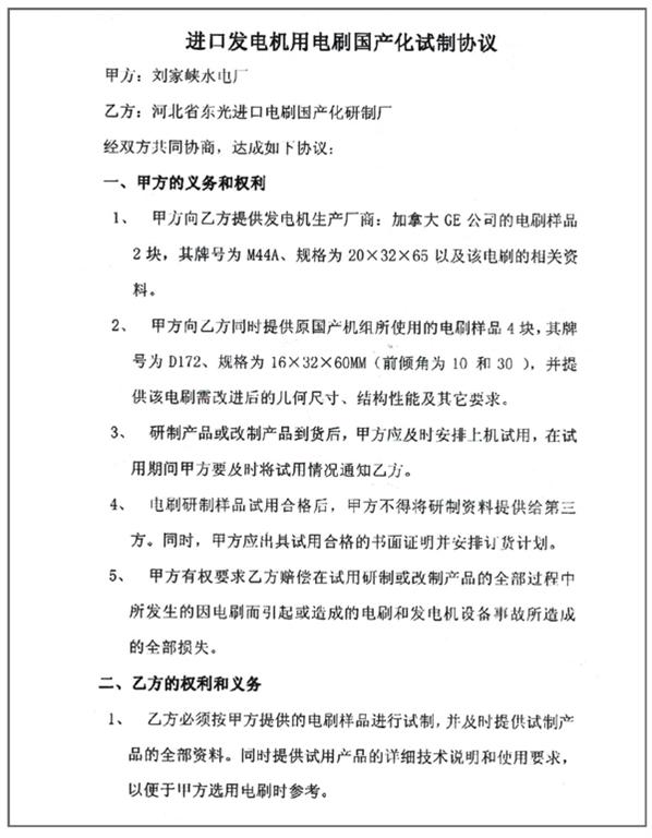 進(jìn)口發(fā)電機(jī)用電刷國(guó)產(chǎn)化試制協(xié)議